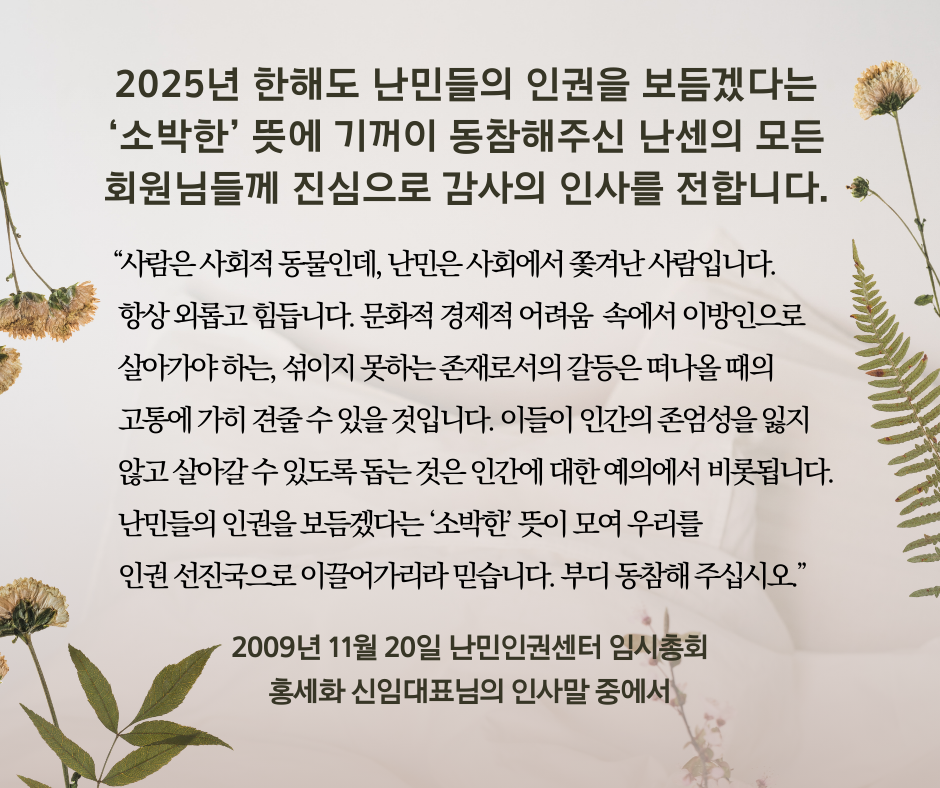 여러모로 쉽지 않은 상황에서도 난센을 지지해주시고, 난민분들의 인권을 보장하는 일에 동참해주셔서 정말 감사드립니다. 새해 영하의 날씨이지만, 곁의 소중한 사람들과 함께 따듯한 연말연시 되시기를 바랍니다. 난센 사무국이 회원님들과 연대자님들의 소박한 행복의 일상을 응원하고 있겠습니다! 올 한해 정말 고생 많으셨습니다.
